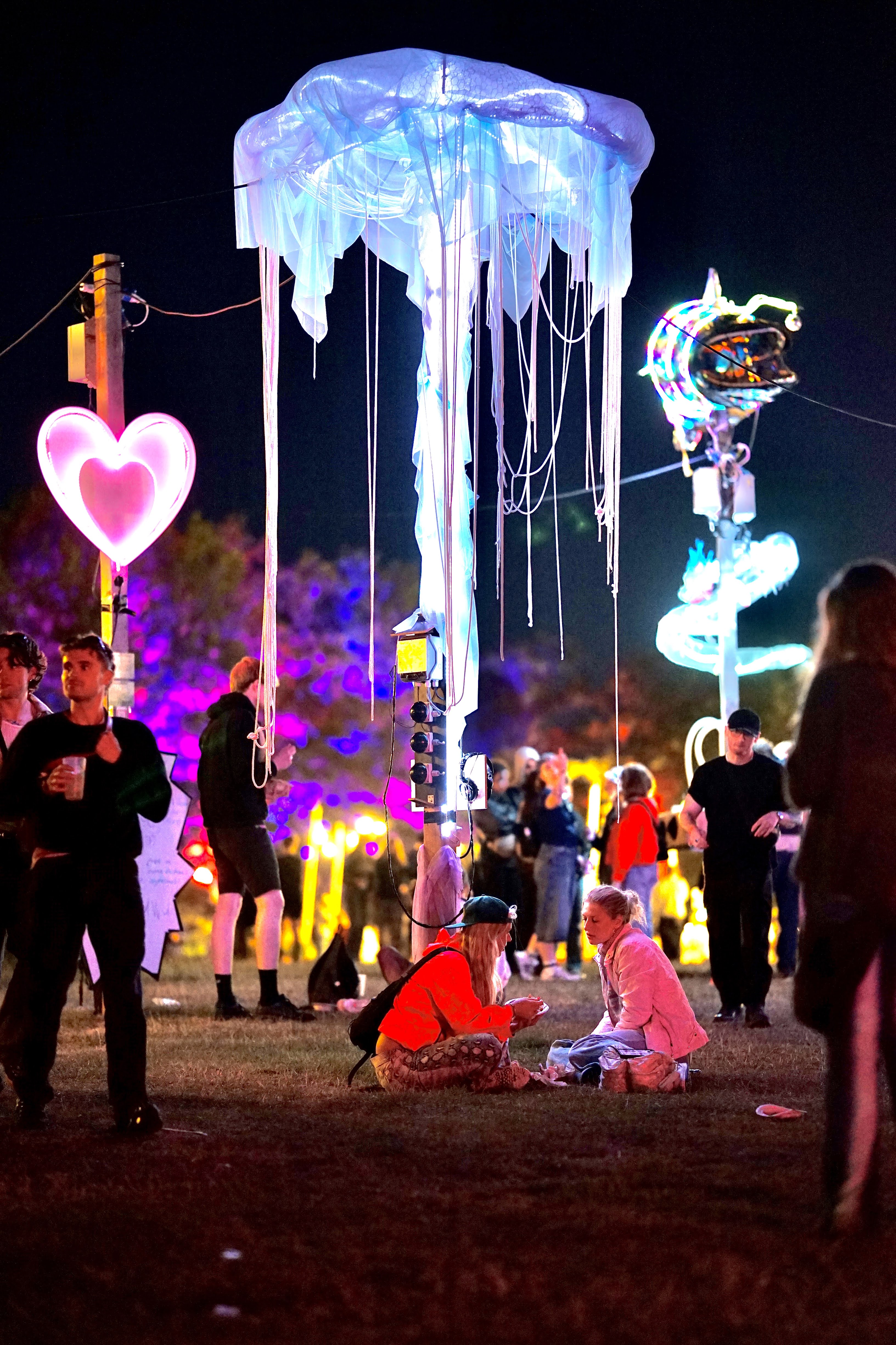 The installation is a large, soft light form inspired by a jellyfish, inviting festival guests to take a break amid the noise and chaos. It is designed to create calm and presence – not through instructions, but through atmosphere, light, and movement. When you come close and touch it, a soft, pulsing light is activated, moving up through the structure.